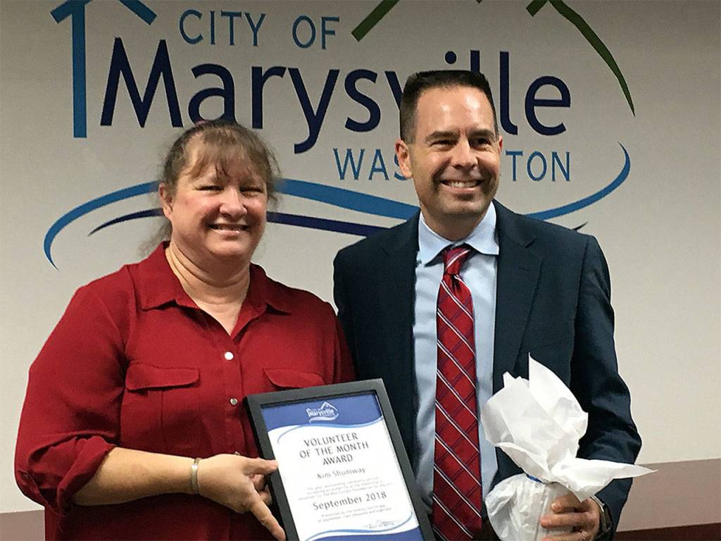 Kim Shumway was honored Sept. 24 by Marysville Mayor Jon Nehring as the city’s Volunteer of the Month.