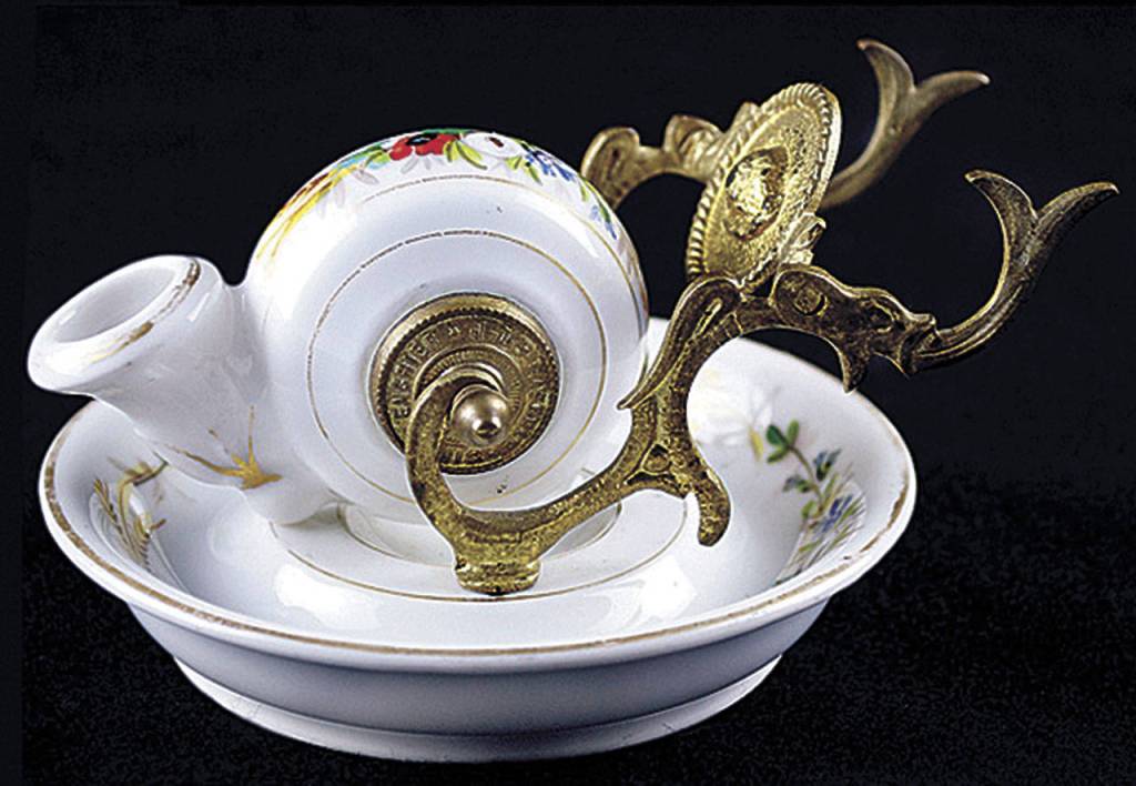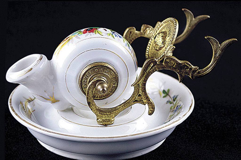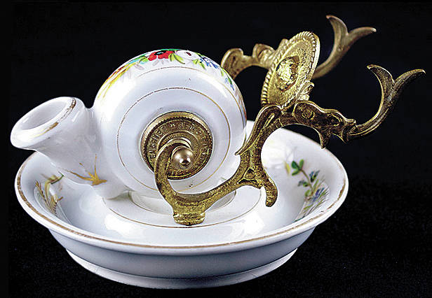 The era of the inkwells that interests most collectors began in the 18th century. Elaborate ceramic containers to hold ink on a desk as part of a set in an inkstand were important accessories. Soon all inkwells were glass set in metal or other leakproof containers that could screw or clamp shut. One of the most unusual is the porcelain “snail,” a revolving, tilting inkwell. It looks like a snail shell on a metal frame standing on a saucer. The bottle revolves so the snail’s head tilts up, exposing the opening for the pen. There are even twin snail holders.