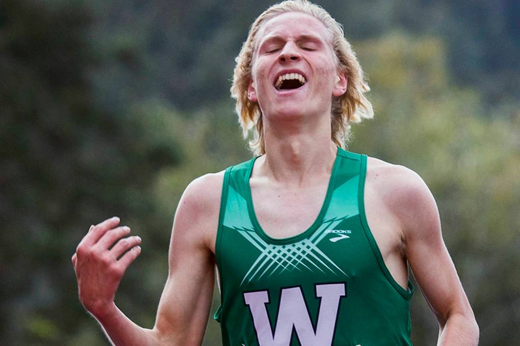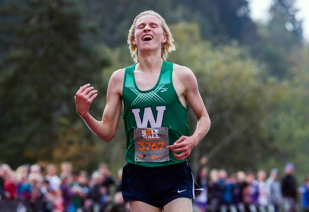 Woodinville’s Luke Houser smiles after breaking the race record during the Hole in the Wall Cross Country Invitational at Lakewood High School on Oct. 6 in Arlington. (Olivia Vanni / The Herald)