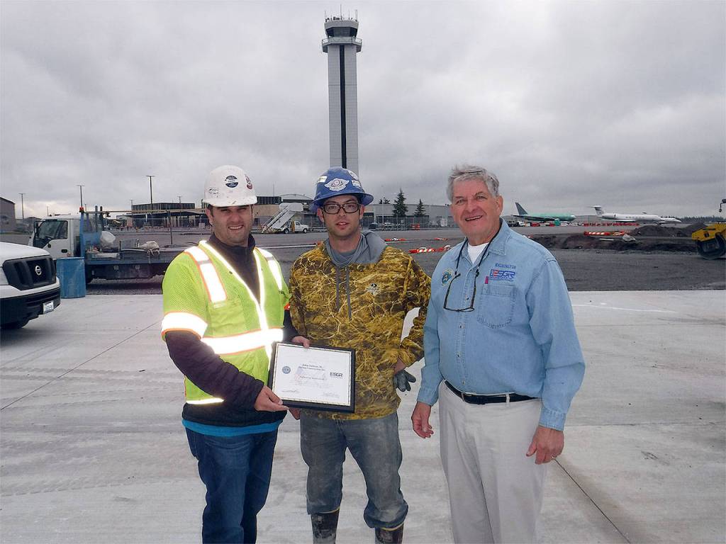 John Salinas II of Salinas Construction of Mukilteo (left) accepts the Employer Support of the Guard Reserve Patriot Award from employee Donny Passey (center) and ESGR’s John Van Dalen at the site of a new taxiway and aircraft parking ramp the company is building within view of the control tower at Paine Field. (Contributed photo)