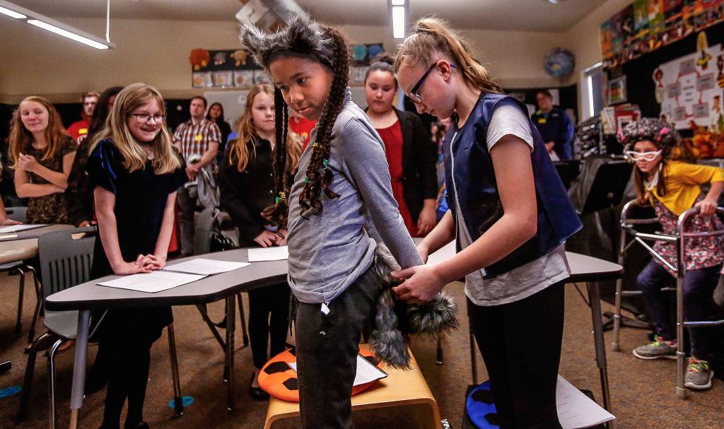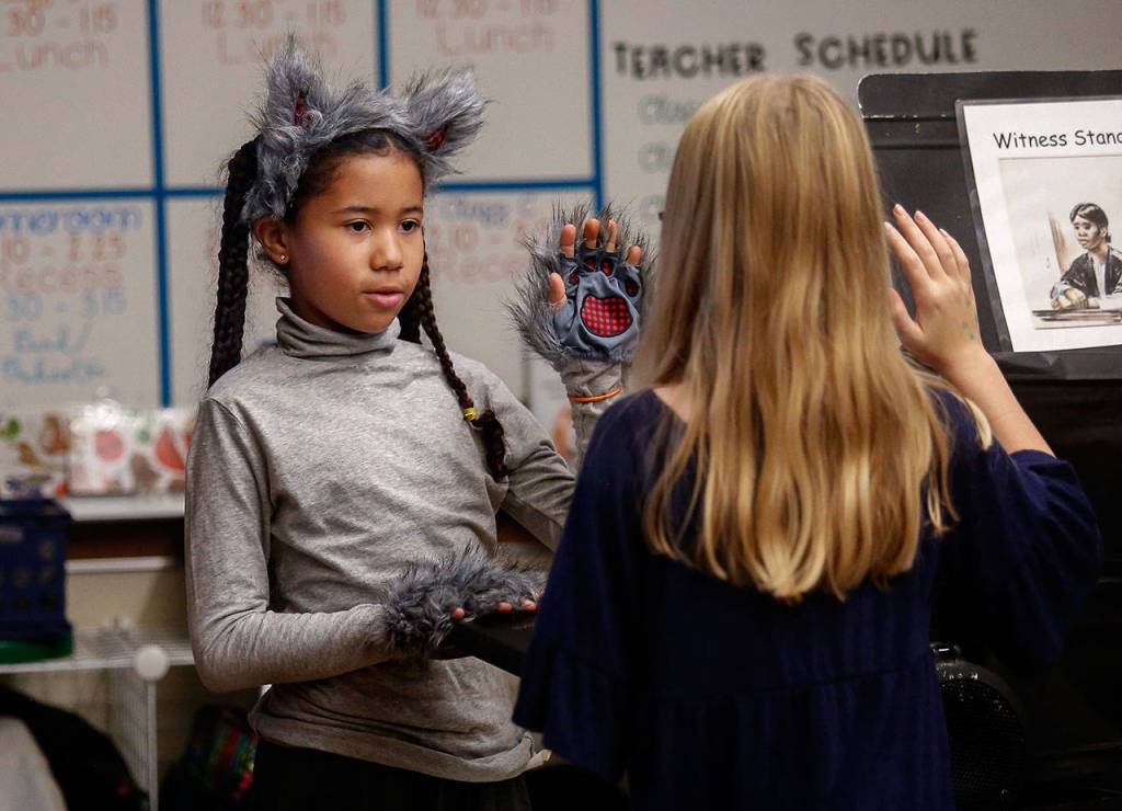 At the front of the classroom, “Sneezy the Wolf” — fifth-grader Sophie McDonald in costume — was on the stand.
