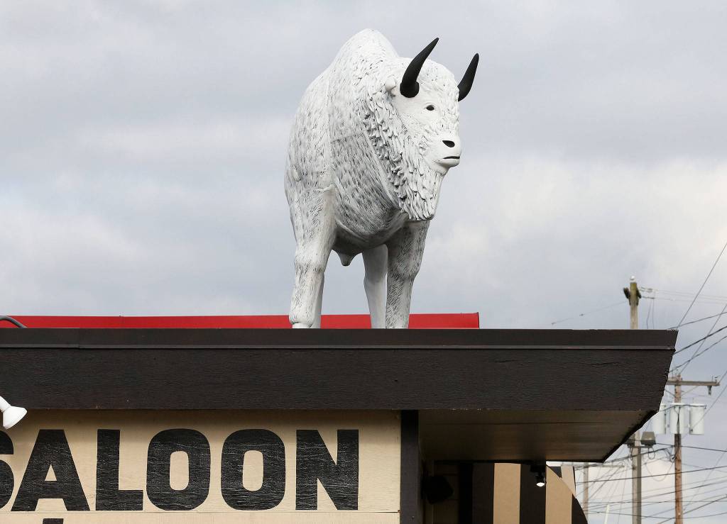 Evergreen Way’s landmark white buffalo was moved to the roof of White Buffalo Saloon due to damage and attempted theft. (Kevin Clark / The Herald)