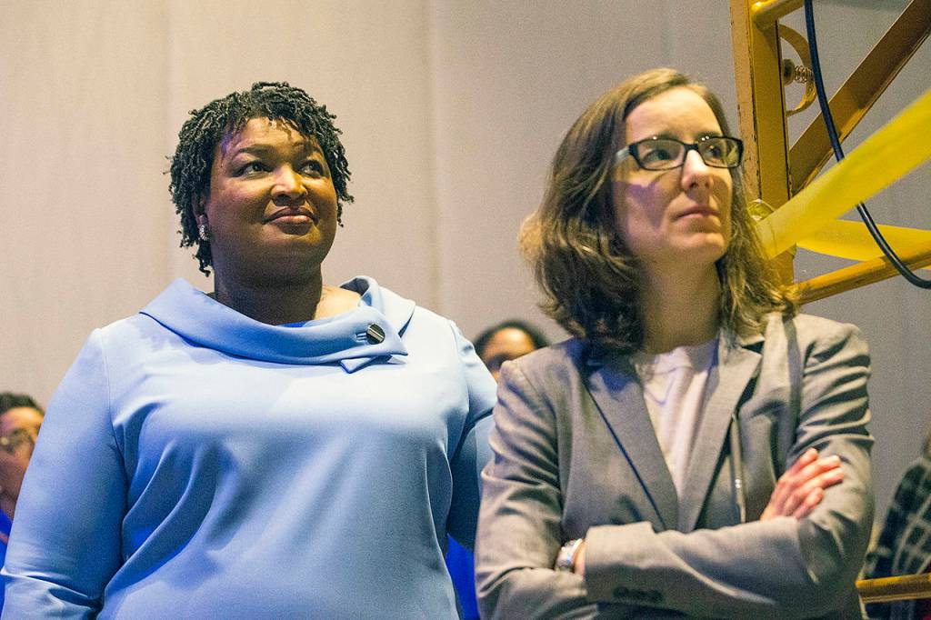 Georgia gubernatorial candidate Stacey Abrams (left) stands with her campaign manager, Lauren Groh-Wargo, before speaking to her supporters during an election night watch party at the Hyatt Regency in Atlanta, on Wednesday. (Alyssa Pointer/Atlanta Journal-Constitution via AP)