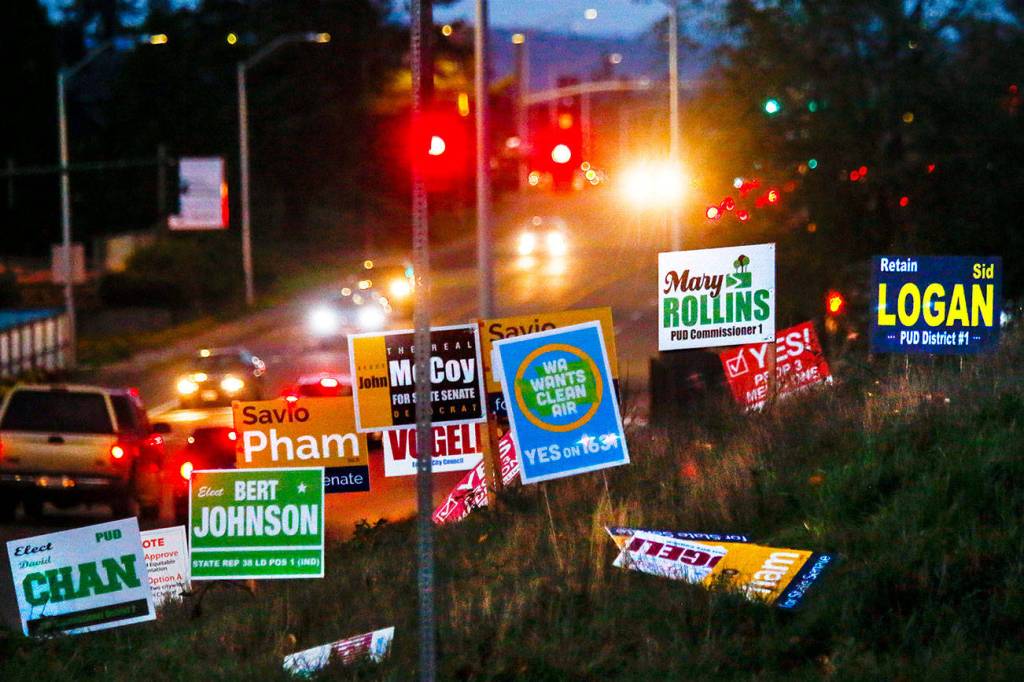 Just before dusk Wednesday, there remained no fewer than 16 political signs next to the sidewalk on the northeast corner of Colby Avenue and 44th Street in Everett. More were down, littering the grass nearby.
