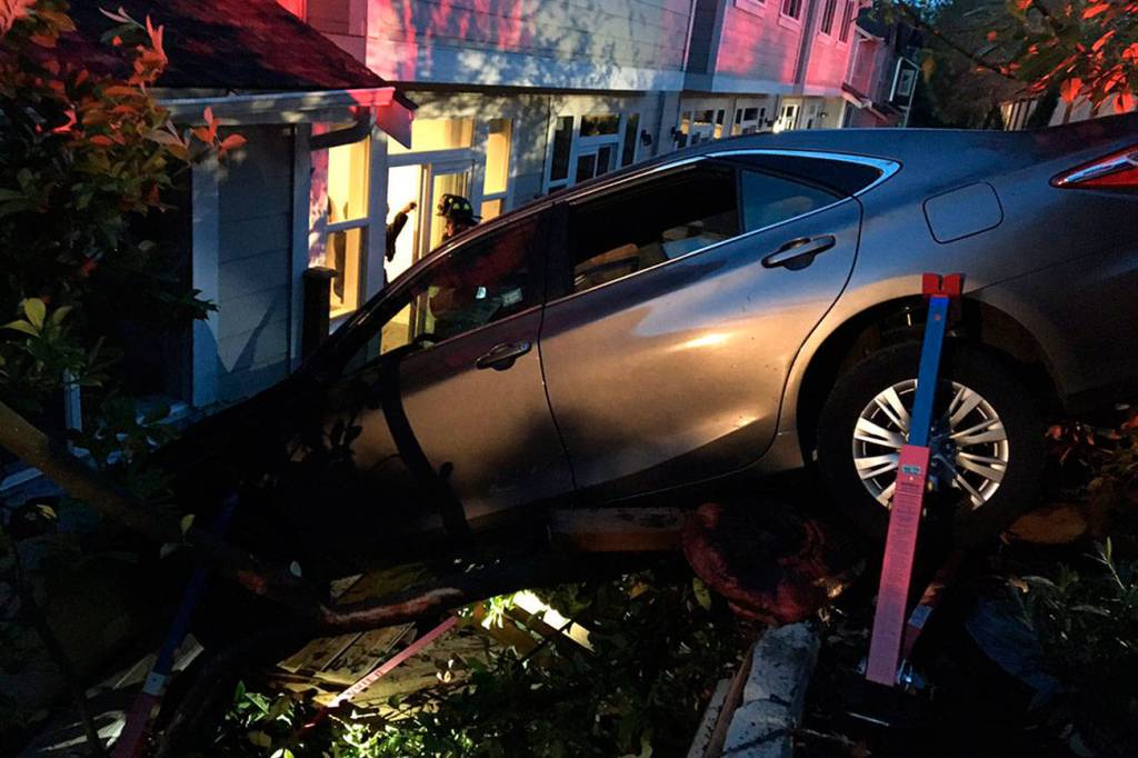 MOUNTLAKE TERRACE — A car with five people inside went over an embankment and came to rest against the wall of an apartment building in the 4400 block of 212th Street SW on Monday afternoon.