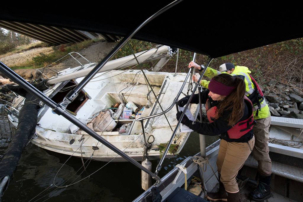 Last week, Pozarycki headed out on Steamboat Slough with Luke Hanna a biologist with the surface water management program. They posted a 30-day notice on a sailboat washed up under the I-5 bridge.