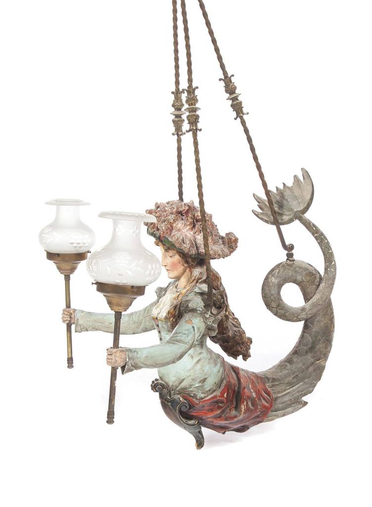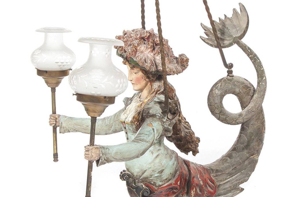 A hanging lamp from the 19th century with a carved mermaid, dressed in fashionable clothing and a feathered hat, was auctioned recently by Garth’s. She is holding two light fixtures with glass shades. The fixture, suspended on three decorated chains, sold for $1,500.