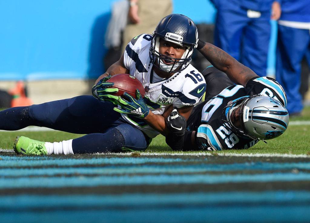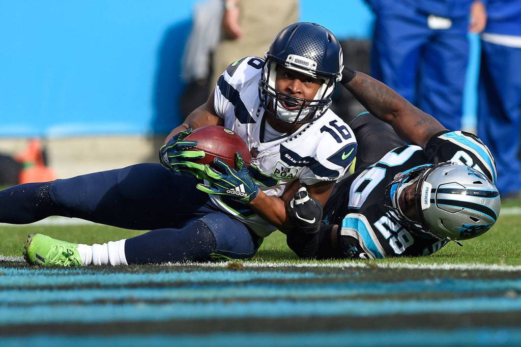 The Seahawks’ Tyler Lockett (16) catches a touchdown pass against the Panthers’ Mike Adams (29) during the second half of a game on Nov. 25, 2018, in Charlotte, N.C. (AP Photo/Mike McCarn)