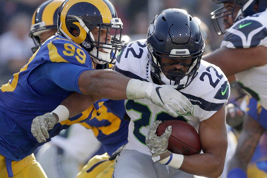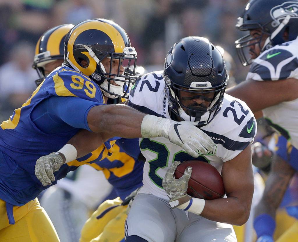Rams defensive end Aaron Donald (left) tackles Seahawks running back C.J. Prosise during the first half of a game on Nov. 11, 2018, in Los Angeles. (AP Photo/Alex Gallardo)