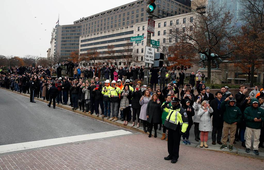 His hearse was then driven in a motorcade to the cathedral ceremony, slowing in front of the White House. Bush’s route was lined with people much of the way, bundled in winter hats and taking photos.
