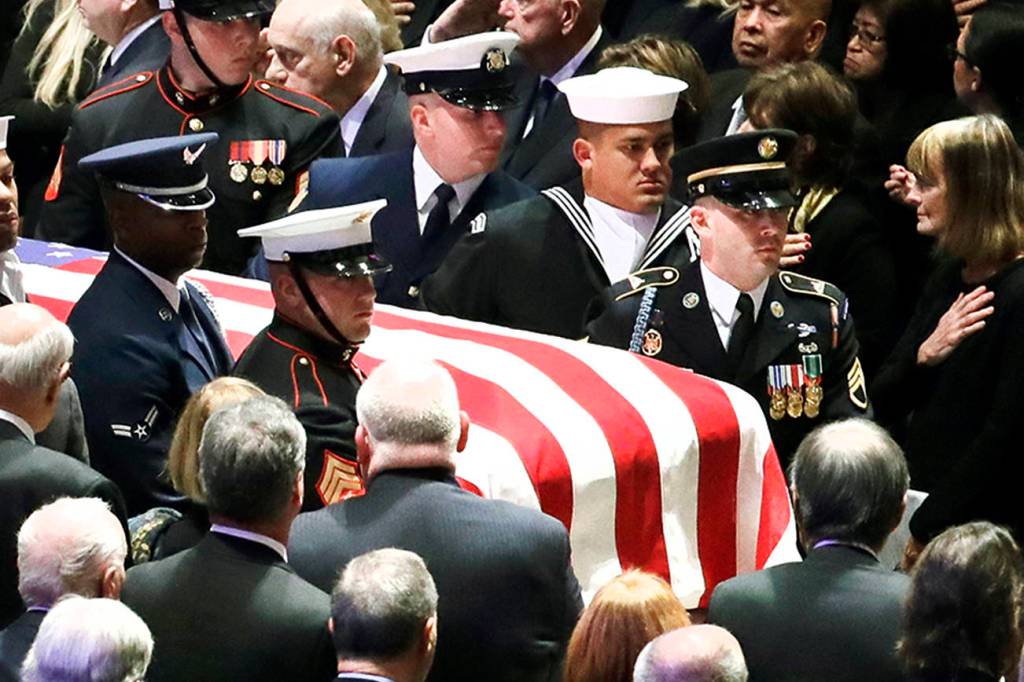The congregation at the cathedral, filled with foreign leaders and diplomats, Americans of high office and others touched by Bush’s life, rose for the arrival of the casket, accompanied by clergy of faiths from around the world. In their row together, President Donald Trump and former Presidents Barack Obama, Jimmy Carter and Bill Clinton stood with their spouses and all placed their hands over their hearts.