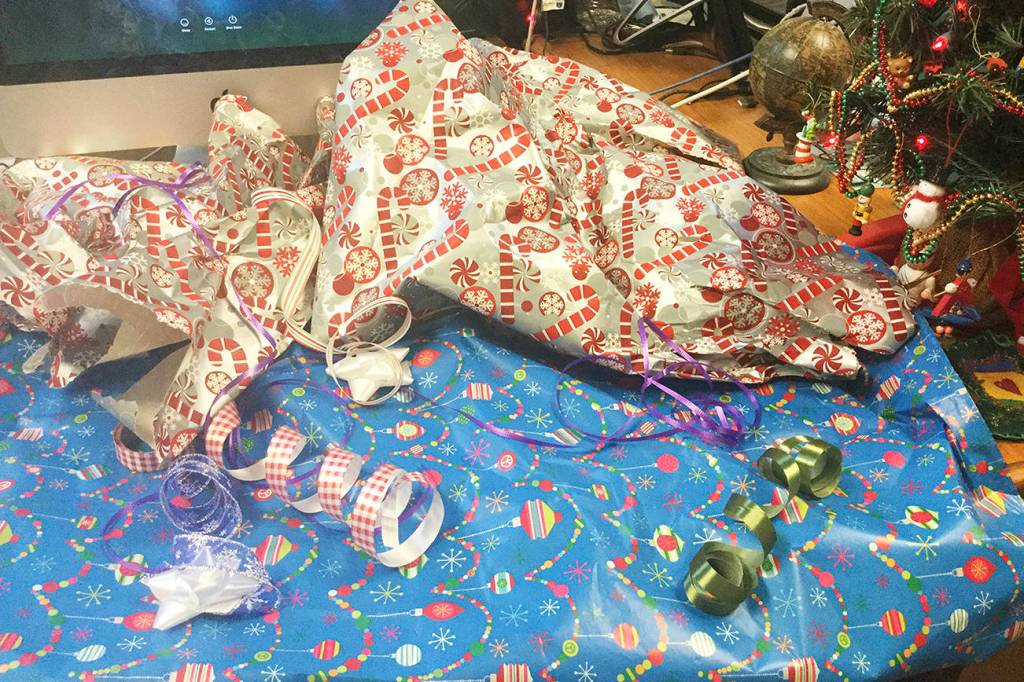 The gift wrap alone may be fine if it’s glitter-free and intact, but the sticky glue on bows is a contaminant and ribbons are “tanglers” notorious for snagging in machinery that separates naughty recyclables from nice for reuse.