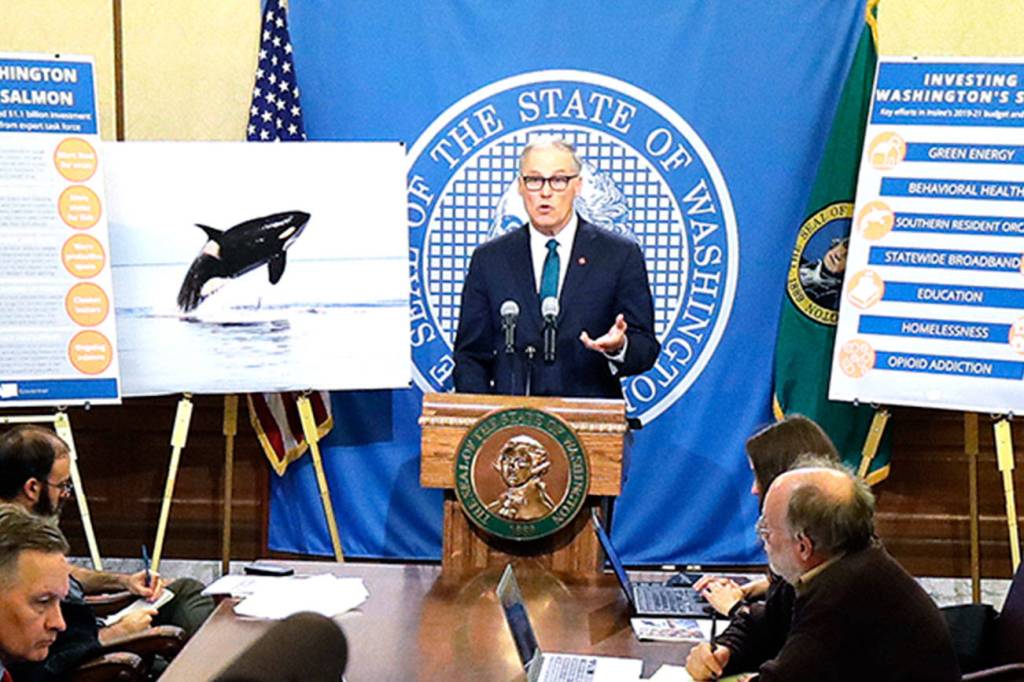 OLYMPIA — Gov. Jay Inslee is proposing a new capital gains tax and an increase in business taxes on services as part of his next two-year budget proposal that looks to increase spending on the state’s mental health system and the environment, including efforts to help the state’s struggling orca population.