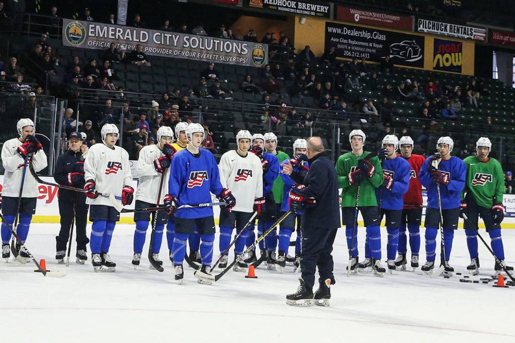 “It’s just exciting,” said Ross Kruse of Edmonds, who attended Saturday’s session accompanied by his son Max, a member of the Mountlake Terrace-based Seattle Junior Hockey Association’s 14U A1 team. “The tournament coming up is a big deal in the hockey world, and the chance to see these kids try to earn a spot is a really unique and unusual opportunity.”