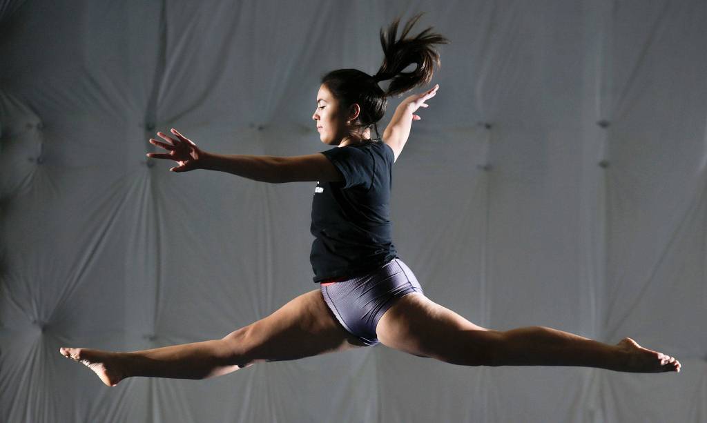 Shorecrest senior Victoria “Tory” Collins performs a split leap on the beam during practice at Cascade Elite Gymnastics on Dec. 19 in Everett. (Andy Bronson / The Herald)