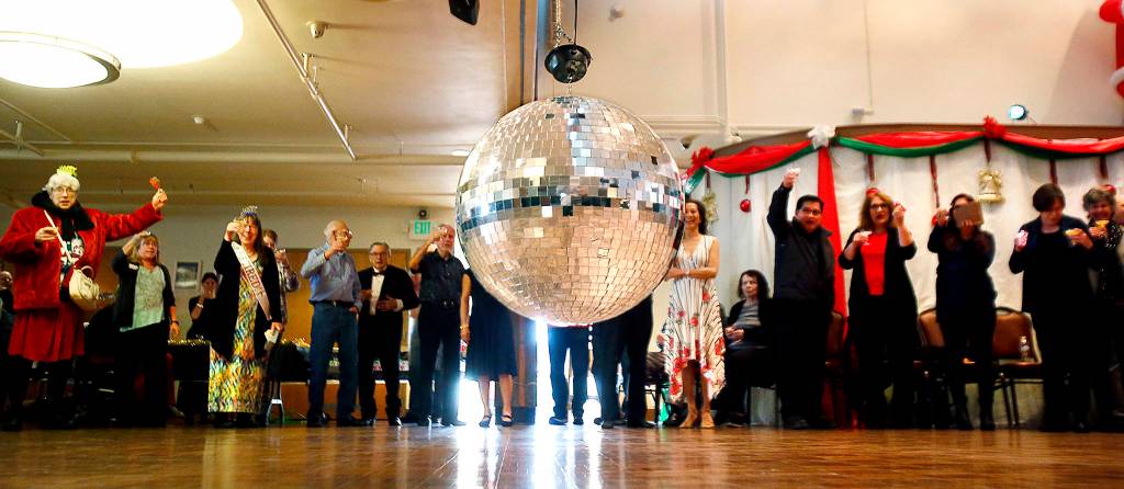 The partygoers line up at the Carl Gipson Senior Center in Everett during the New Year’s Eve party Dec. 31 to watch the glass ball lower to the floor during countdown. (Dan Bates / The Herald)
