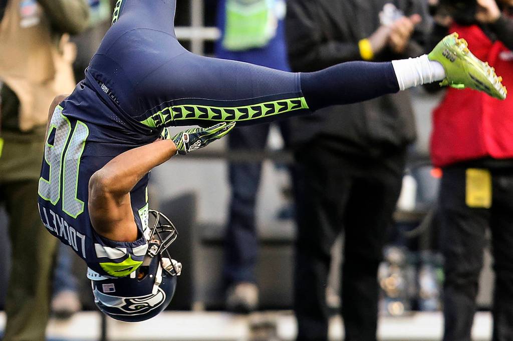 Tyler Lockett flips as he crosses the end zone for a touchdown as the Seattle Seahawks led the Arizona Cardinals 7-3 in the first quarter at CenturyLink Field on Dec. 30 in Seattle. The touchdown made Russell Wilson the leader in passing touchdowns in Seahawks history. (Andy Bronson / The Herald)