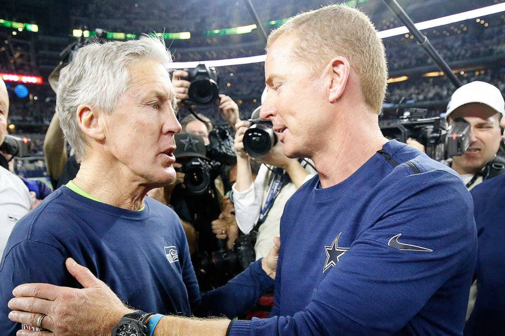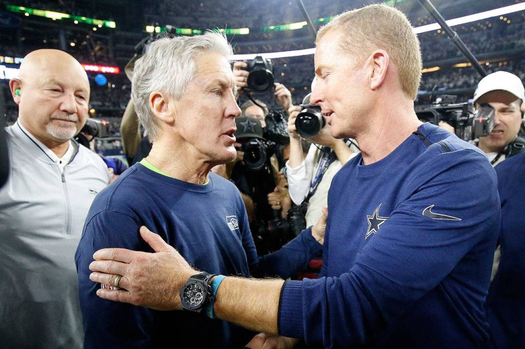 Seattle head coach Pete Carroll (left) congratulates Dallas head coach Jason Garrett after the Cowboys beat the Seahawks 24-22 in an NFC wild-card playoff game Saturday in Arlington, Texas. (AP Photo/Michael Ainsworth)