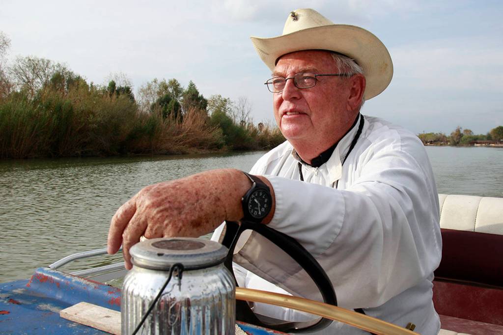 Father Roy Snipes leads prayers each Friday for his chapel to be spared. Wearing a cowboy hat with his white robe and metal cross, he’s known locally as the “cowboy priest” and sometimes takes a boat on the Rio Grande to go from his home to the chapel.