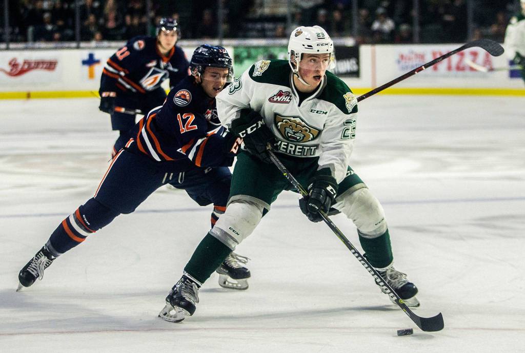 Silvertips’ Jake Christiansen skates with the puck toward the goal during the game against the Kamloops Blazers on Jan. 6 in Everett. (Olivia Vanni / The Herald)