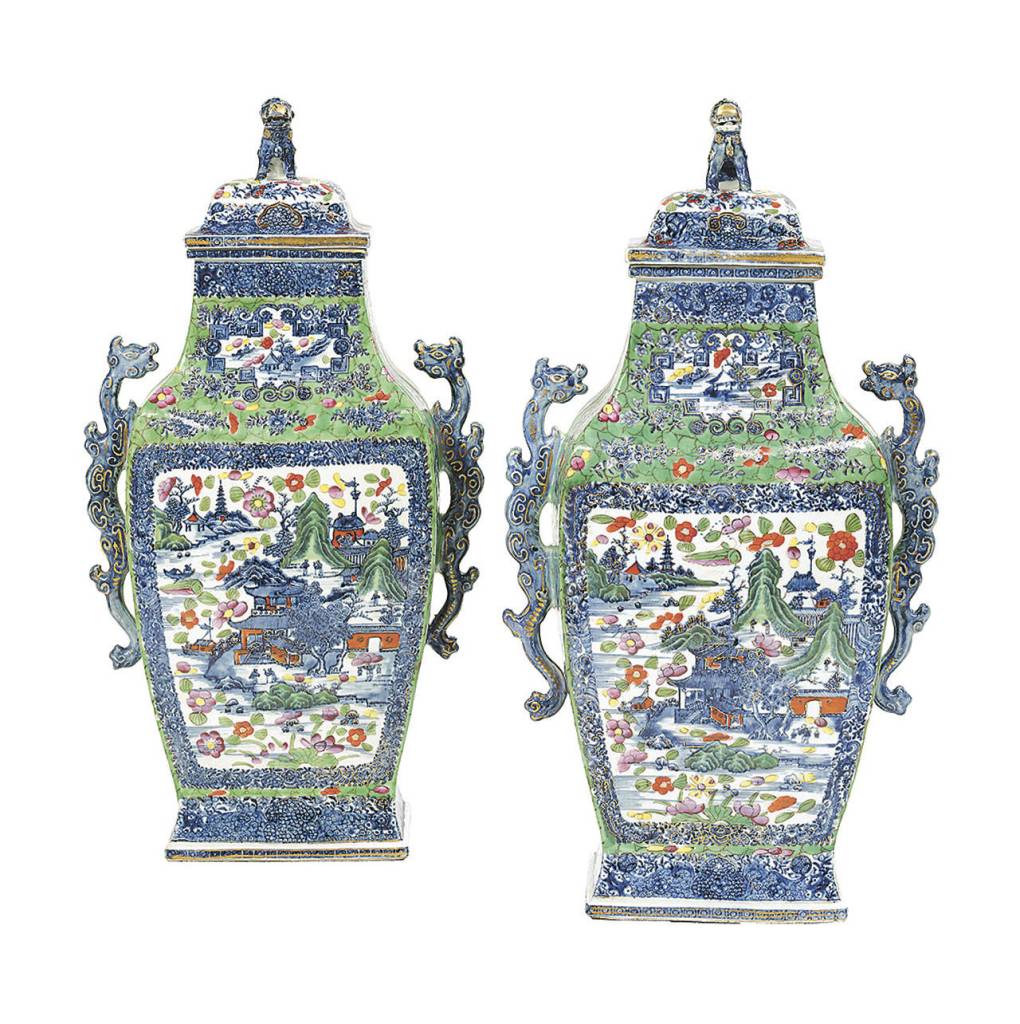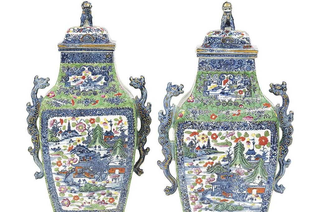 A pair of “Chinese Export clobbered porcelain vases” were sold at a New Orleans auction for $5,750. Clobbering in green, pink, yellow and copper red in the mid-1800s has added to its value today.