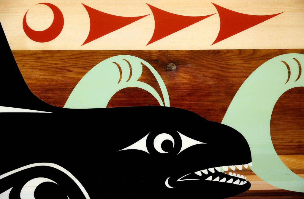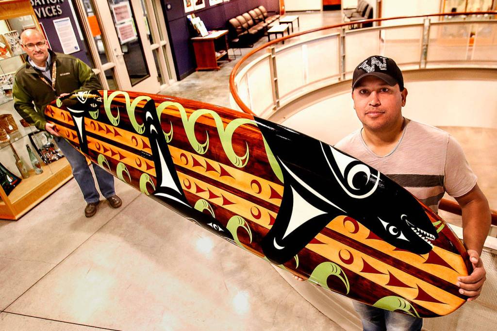“This is special,” said acclaimed Tulalip Tribes artist James Madison, who painted the board with Coast Salish images of orcas and waves of seafoam green.