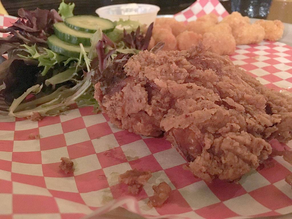An order of the crispy fried chicken comes with a small salad, tater tots, two drumsticks and a breast at That Chicken Place in Everett. The breading was delightfully crunchy and the meat was impeccably juicy. (Ben Watanabe / The Herald)