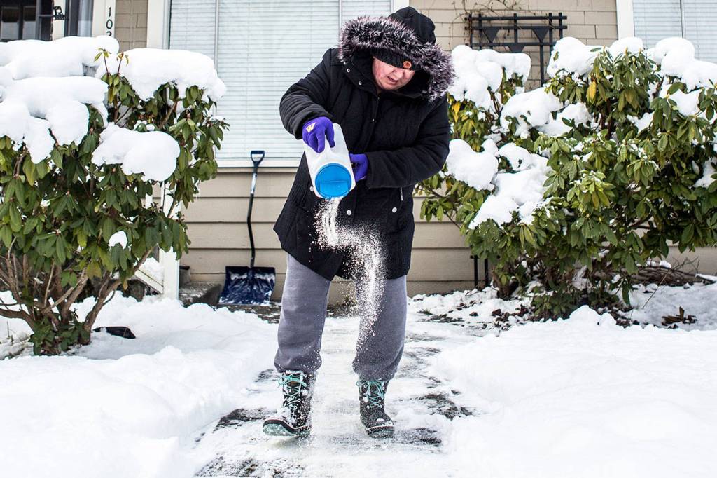 And road salt, the chemical that melts ice to clear driveways and walking paths, apparently is nowhere to be found. O’Reilly Auto Parts in Lake Stevens and Snohomish were all out.