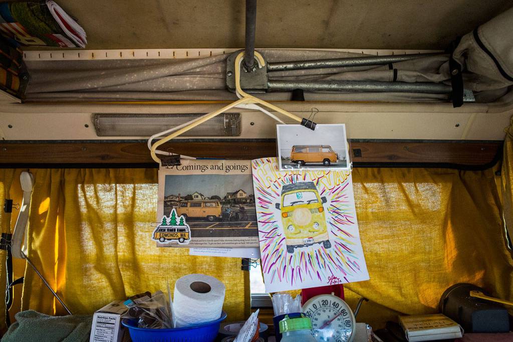 Photos and drawings given to Steve Bell hang in his Volkswagen Westfalia van. (Olivia Vanni / The Herald)