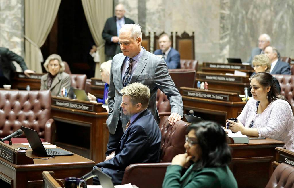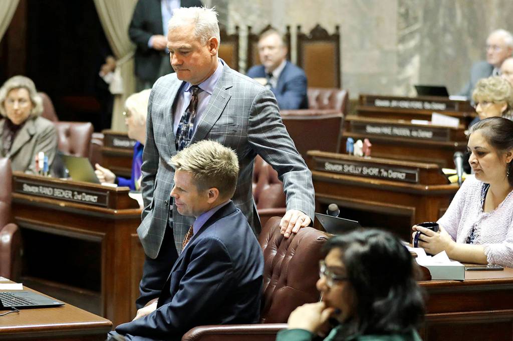 Sen. Reuven Carlyle, D-Seattle (standing center), watches with Sen. Jaime Pedersen D-Seattle (seated center) as votes are tallied Friday on the Senate floor following debate in Olympia on a measure that would repeal the death penalty in Washington state. (AP Photo/Ted S. Warren)