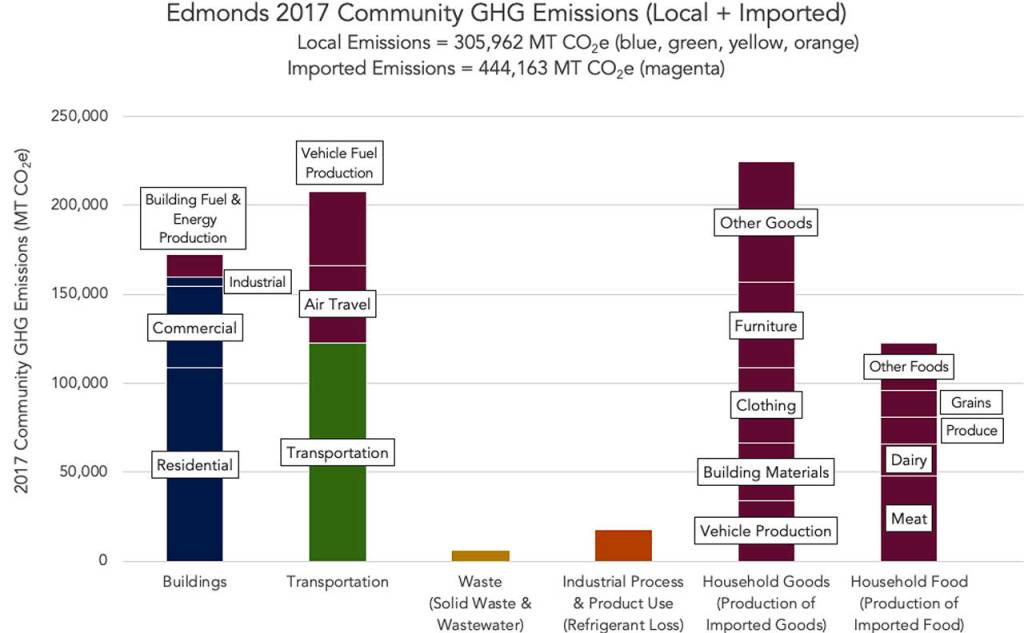The rest, about 444,000 metric tons, was generated outside of Edmonds and imported through the purchase of goods, foods and services. Those emissions total what 95,000 passenger vehicles create in a year, or the carbon sequestered annually by more than 500,000 acres of forest. That’s a land area about 40 times the size of Edmonds.