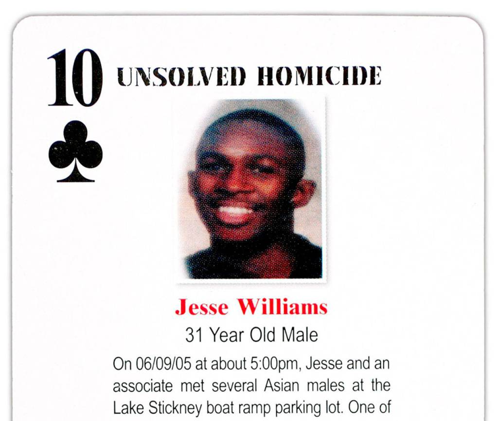 Williams’ face was featured in a set of playing cards that describe cold cases in Snohomish County. The decks were first handed out in jails and prisons across the state in 2008 to generate tips. The case was on the 10 of Clubs.