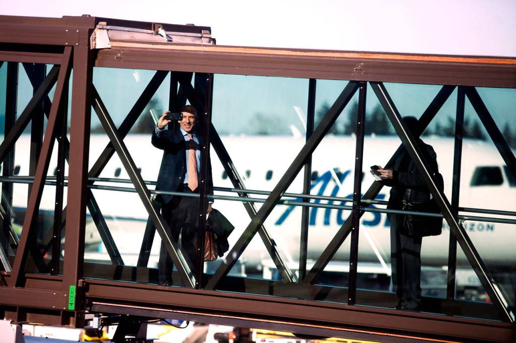 A passenger takes a photo from the glass gangway while boarding an Alaska Airlines flight on first day of regular airline service at Paine Field terminal on Monday in Everett. (Andy Bronson / The Herald)
