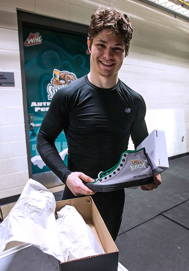 All of which made for a busy stretch for Staniford. Five pairs of shoes were delivered to the team last week, with the players getting their first look at them Thursday morning between practice and boarding the bus for Victoria. This batch was primarily grey with green tongues. The Silvertips logo is stitched into the side, and on the tongue it has the player’s name, number and the words “Hat trick.”
