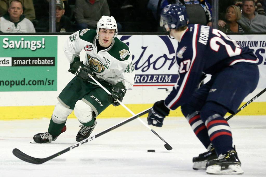 The Silvertips’ Connor Dewar controls the puck with Tri-City’s Nolan Yaremko defending during a playoff game on March 22, 2019, at Angel of the Winds Arena in Everett. (Kevin Clark / The Herald)
