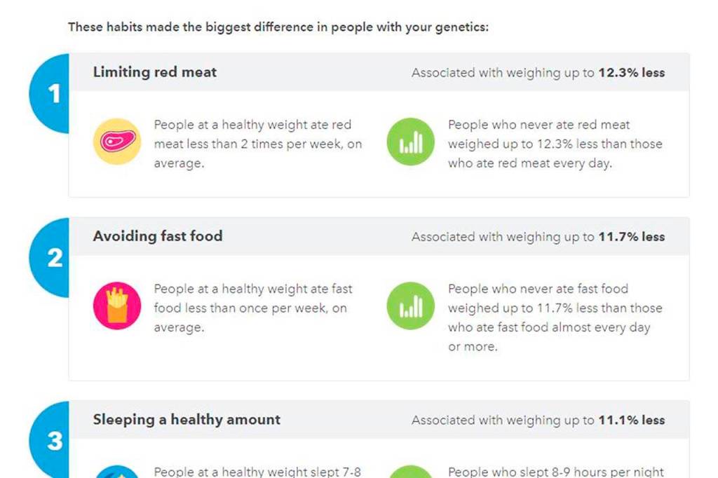 The report then lists 10 habits associated with healthy weights for your DNA profile. For me, that included limiting red meat, avoiding fast food and exercising at least twice a week. Given how formulaic that sounded, I wondered how much results vary for others.