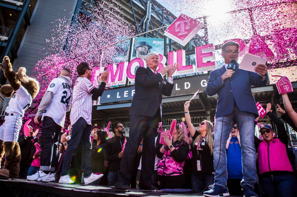 Mariners Chairman John Stanton, center, claps as the confetti canons go off during the T-Mobile Park Gate Opening Ceremony on Thursday, March 28, 2019 in Seattle, Wash. (Olivia Vanni / The Herald)