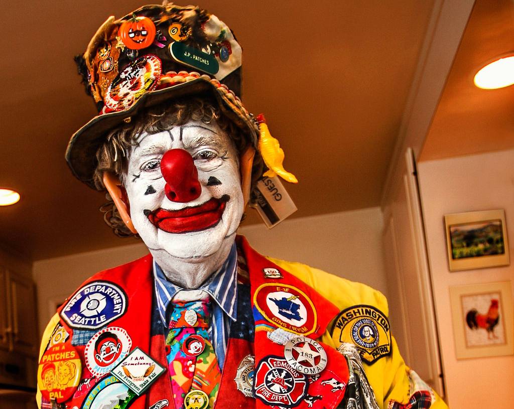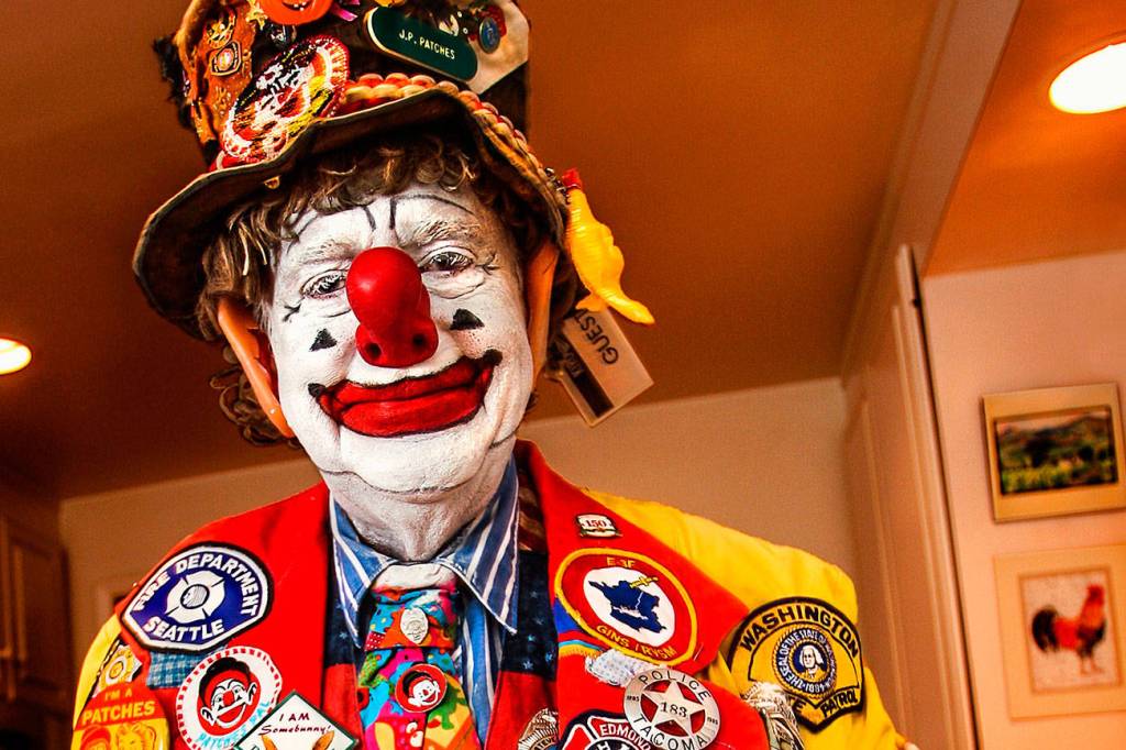 At his home in Edmonds in 2008, Chris Wedes, 80, had transformed himself into the popular clown Julius Pierpont “J.P.” Patches. Wedes was battling cancer, which took his life four years later on July 22, 2012. (Dan Bates / The Herald)