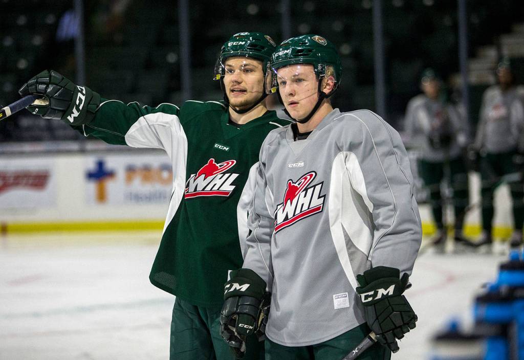The Silvertips’ Zack Andrusiak (left) talks with teammate Jackson Berezowski during practice on Jan. 2, 2019, in Everett. (Olivia Vanni / The Herald)