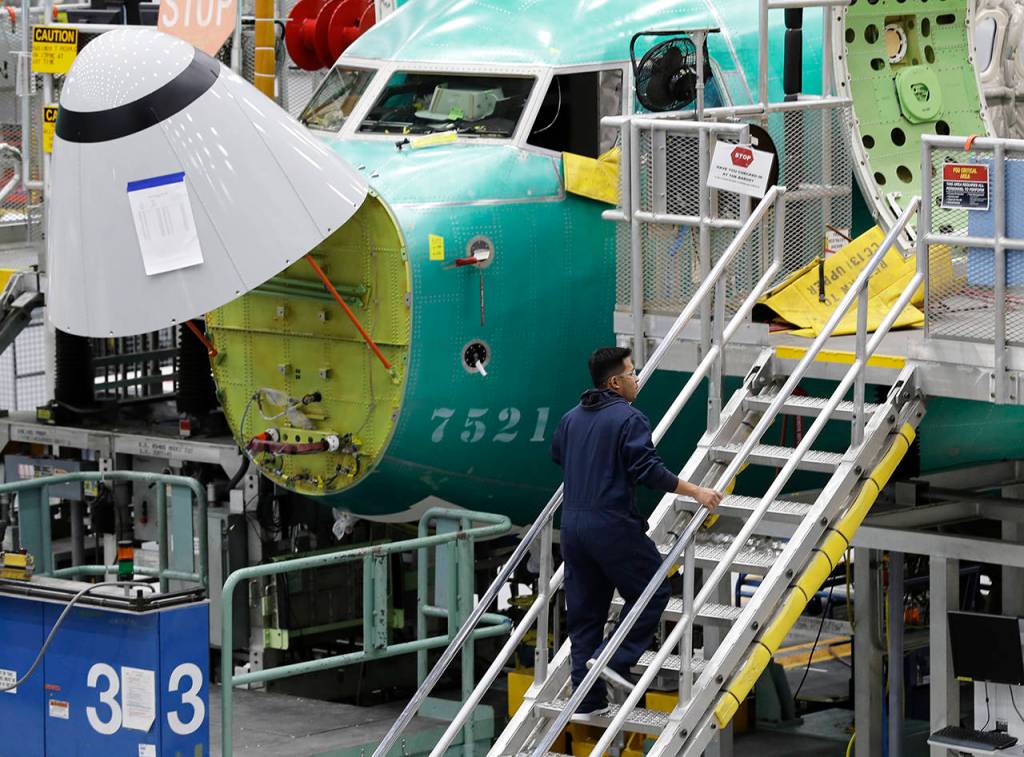 A Boeing 737 MAX 8 airplane is shown on the assembly line during a brief media tour of Boeing’s 737 assembly facility on March 27 in Renton. (AP Photo/Ted S. Warren, file)