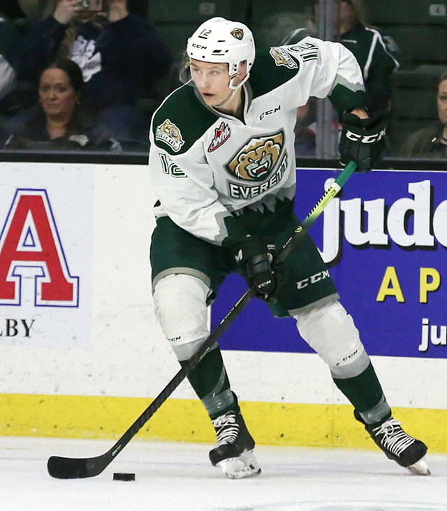 The Silvertips’ Max Patterson controls the puck during a game against the Americans on March 22, 2019, at Angel of the Arena in Everett. (Kevin Clark / The Herald)