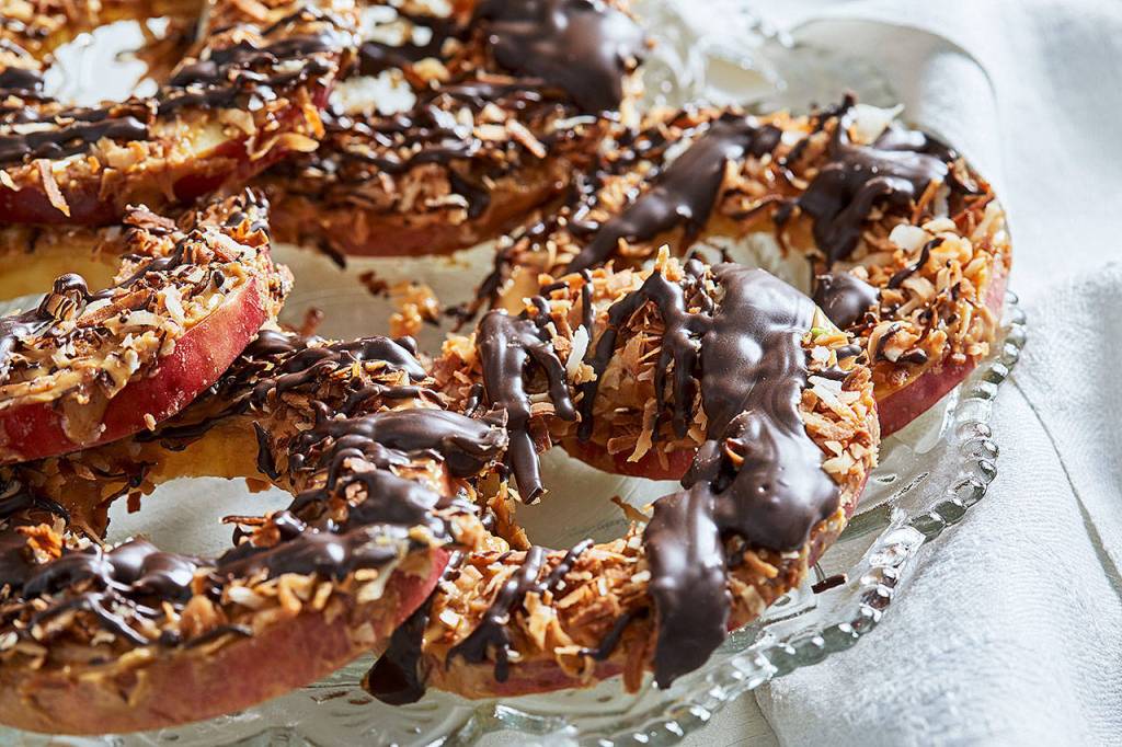 Baking sweetened shredded coconut until it is browned and caramelized achieves the quintessential deep, toasty look and flavor of the cookie. (This can be done up to a week ahead, making the snack easy to pull together on a whim.) That golden goodness is packed onto peanut butter-smeared apple rings (here, sweet red apples work best) and then drizzled with melted chocolate to mimic the look of the iconic cookie.