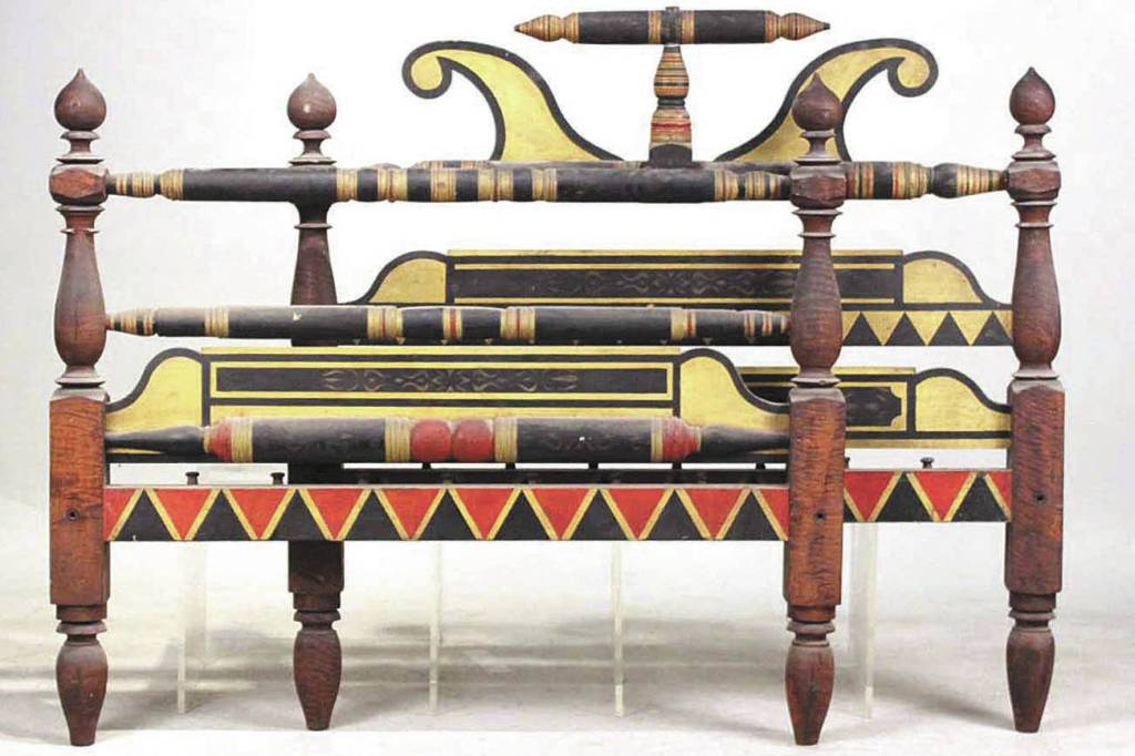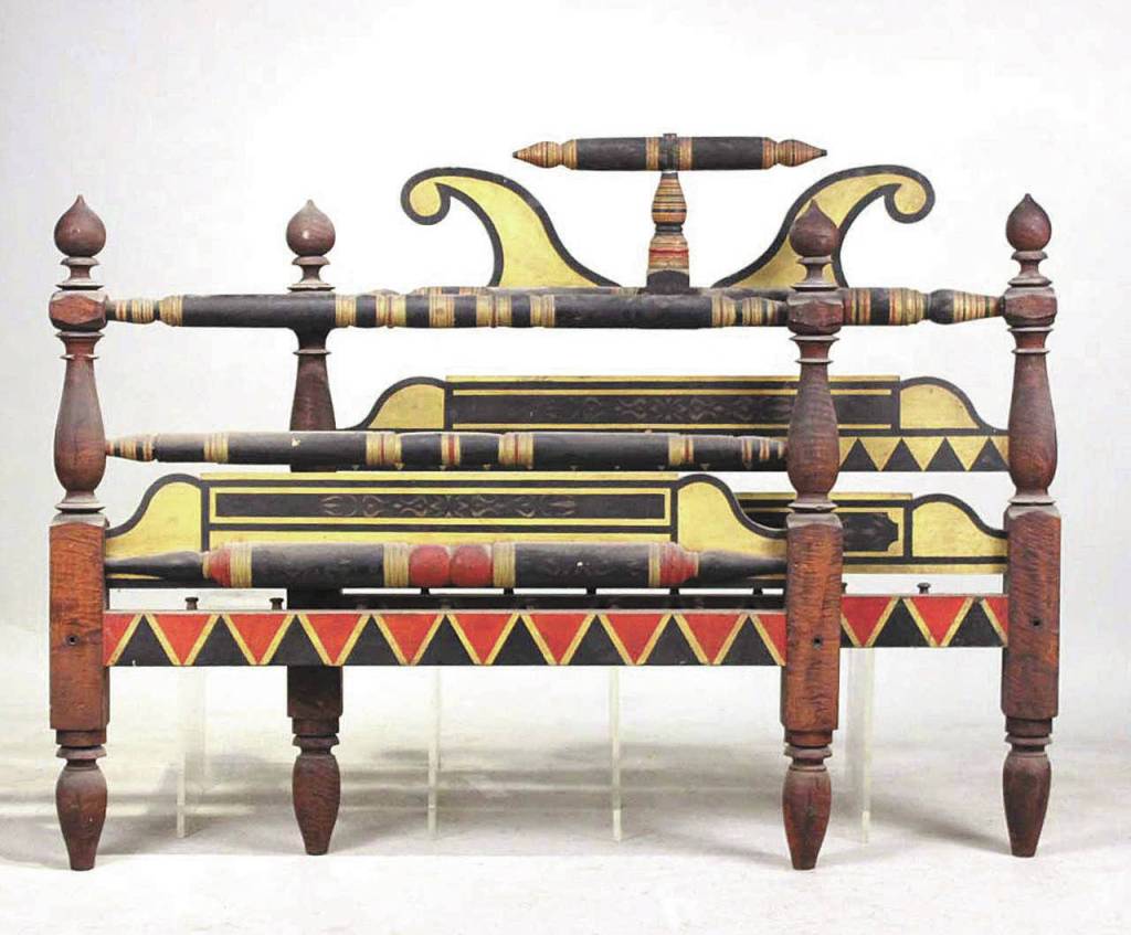 A colorfully painted antique Empire bed made in New England was auctioned by Nye & Co. recently for $12,500.