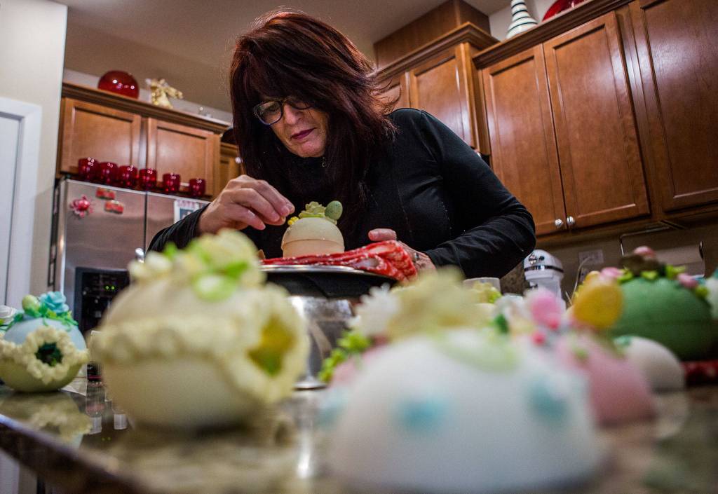 Her decorative Easter eggs are made from sugar. Then, drawing on the skills she honed as a cake decorator, she adds scrolls, roses and other frosted flourishes by hand to each one.