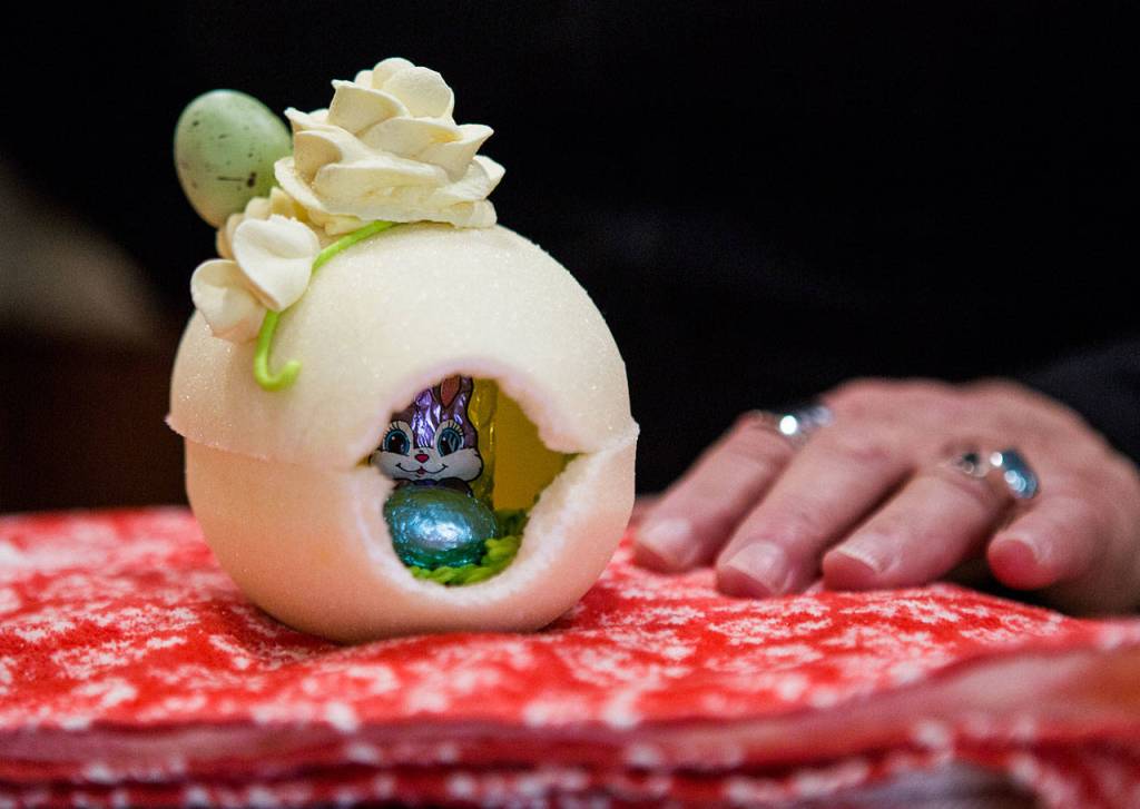 She uses frosting to decorate the exterior of each egg. It takes two to three days to complete the process, time to allow the decorative frosting to harden.