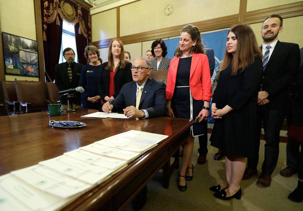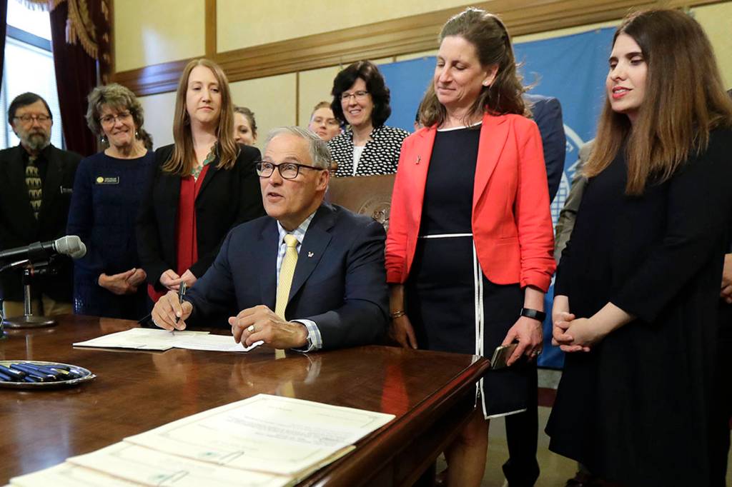 Washington Gov. Jay Inslee makes remarks before signing a bill into law Wednesday at the Capitol in Olympia. (AP Photo/Ted S. Warren)