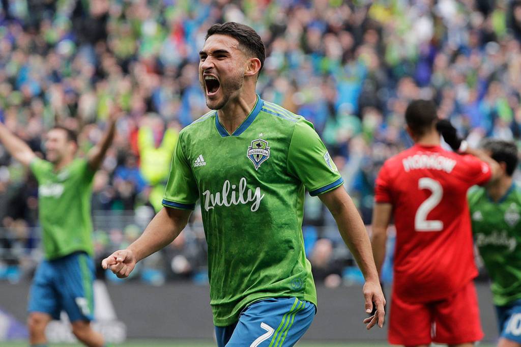 Sounders midfielder Cristian Roldan celebrates after he scored a goal against Toronto FC during the second half of an MLS match on April 13, 2019, in Seattle. (AP Photo/Ted S. Warren)