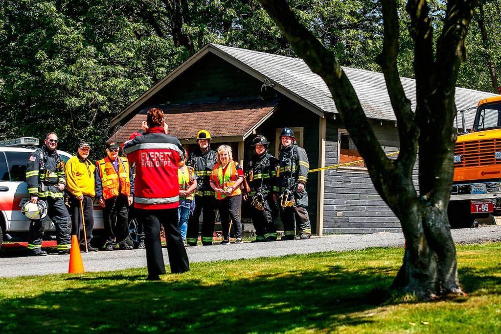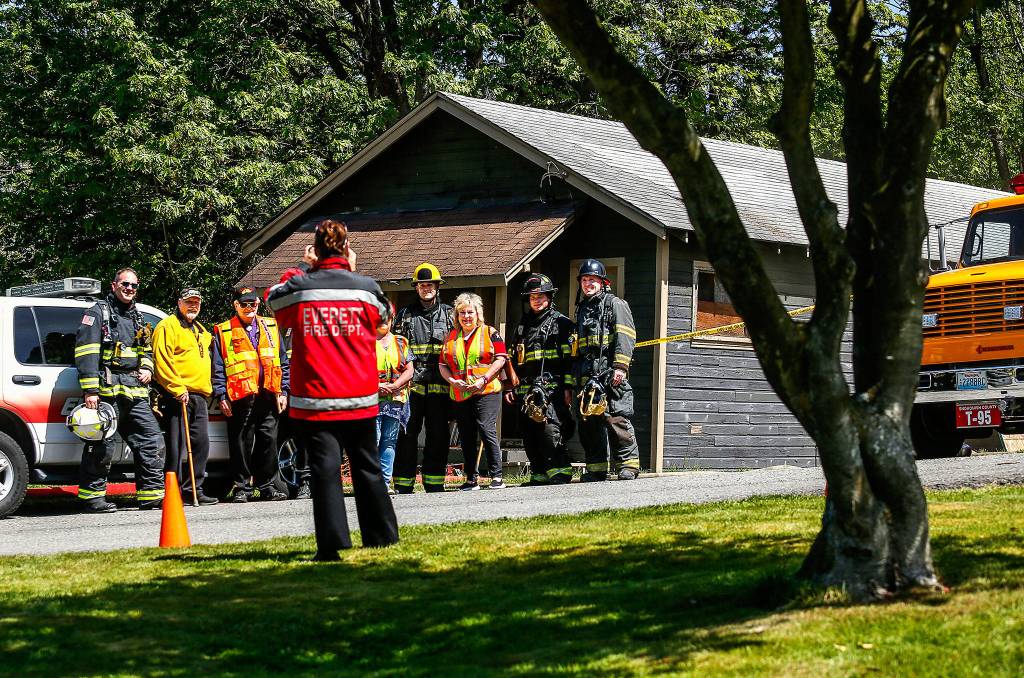 Following a training session Tuesday, Rachael Doniger, the Everett Fire Department’s public education coordinator, snaps a photo of firefighters and onlookers, including John Estie and William Vincent (second and third from left) with interest in the old Scout Shack, former home of Everett’s Troop 1. (Dan Bates / The Herald)