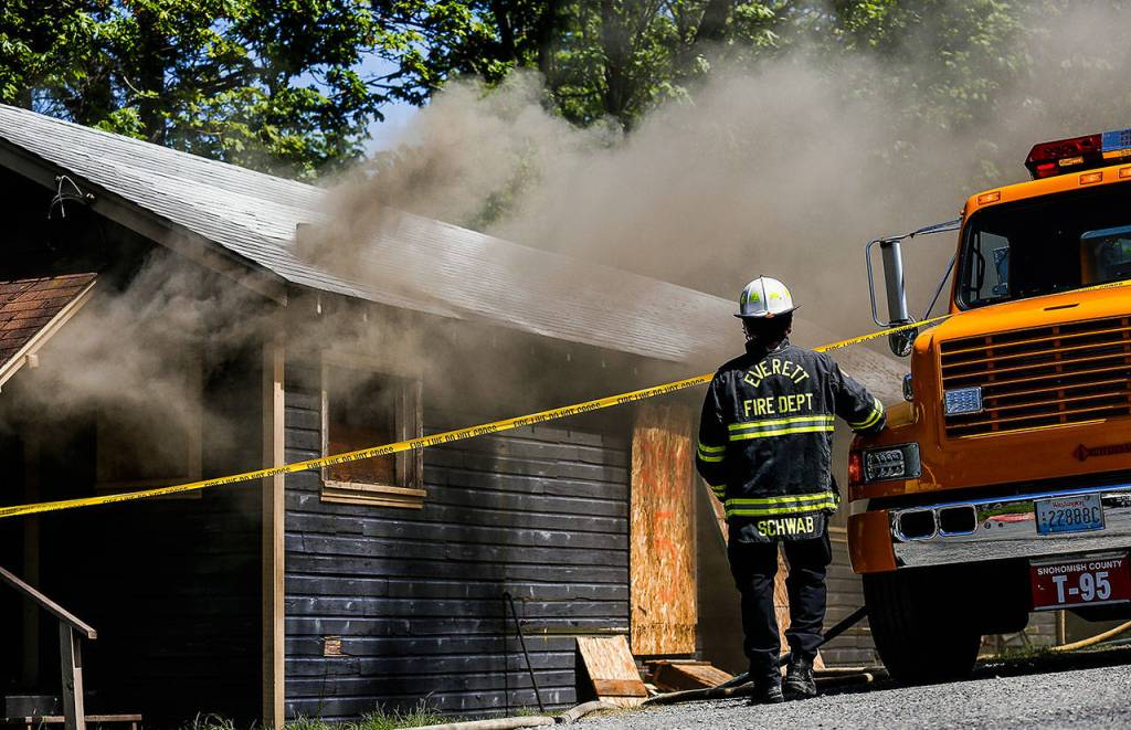 Smoke poured through a hole in the roof of a rustic building in Everett’s Port Gardner neighborhood. As firefighters worked in the midday sun, 79-year-old John Estie stood by with other onlookers.