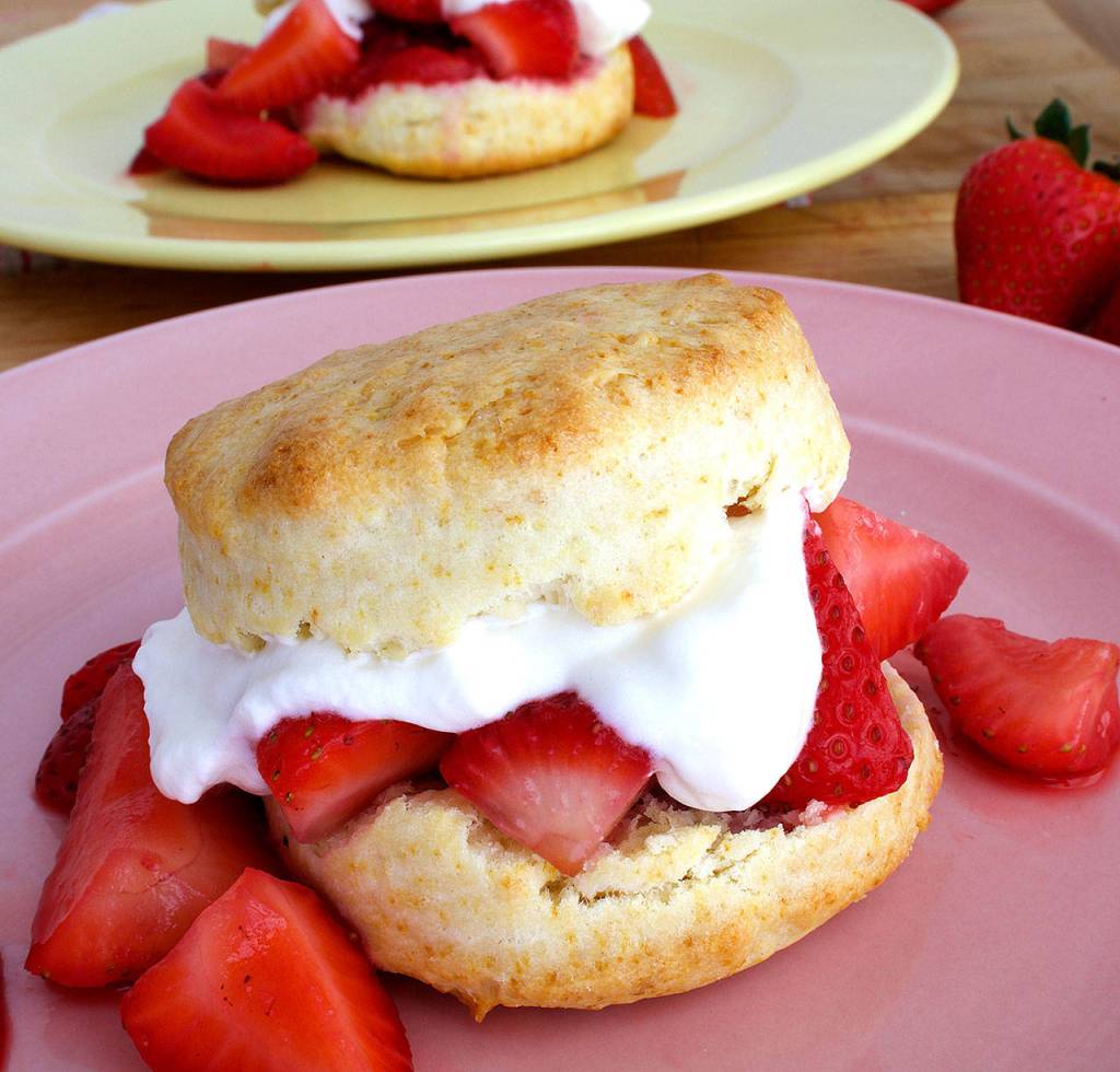 Assemble the shortcakes: Split the cooled biscuits in half and place the bottoms on individual plates. Spoon a generous amount of strawberries on top of the biscuit bottoms and top with a small amount of whipped cream. Add the biscuit tops, plus more strawberries and a dollop of whipped cream, and serve. Makes 8 to 10 servings.